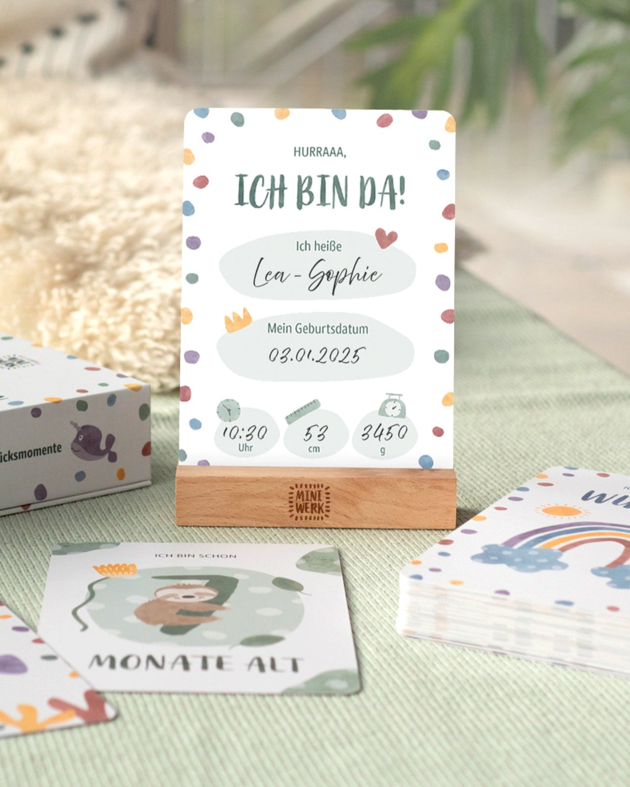 Unser kreatives Baby Meilensteinkarten Set ist gefüllt mit Meilensteinen, Erlebnissen , Babyabdrücken und allerlei Glücksmomenten, die individuell auf jeder Kartenrückseite ausgearbeitet werden. Ausgearbeitet entsteht ein wertvoller Erinnerungsschatz an die unvergessliche Babyzeit.