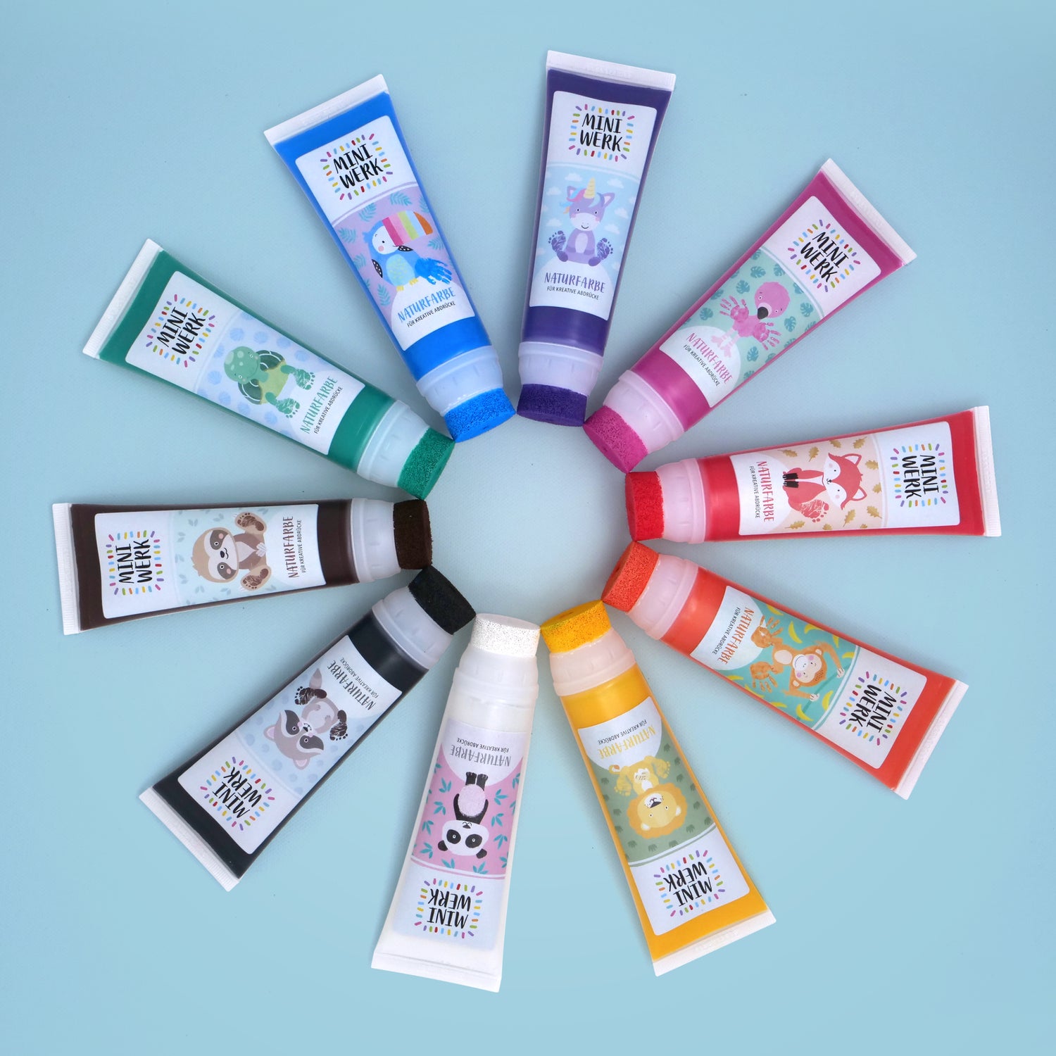 Der Schwammaufsatz ermöglicht gleichmäßiges Auftragen der Farbe auf der Haut um wunderschöne Hand- und Fußabdrücke zu gestalten. Er erweitert zu dem kreative Möglichkeiten der Kinder wie Tupfen, Stempeln und direktes Malen aus der Tube. Mit unseren Naturfarben gestalten sich schon die Kleinsten ihre Welt so bunt, wie sie ihnen gefällt.