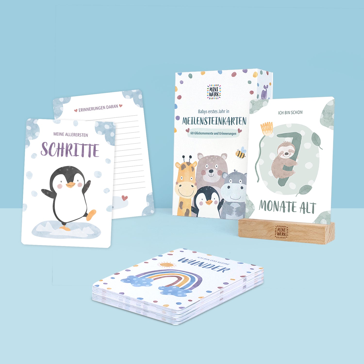 Sie enthält 60 Karten mit den wichtigsten Babymomenten, die auf den Kartenrückseiten wie eine Art Babytagebuch individuell gefüllt werden. Mit dem beiliegenden Holzsockel kann die aktuelle Lieblingskarte aufgestellt werden.