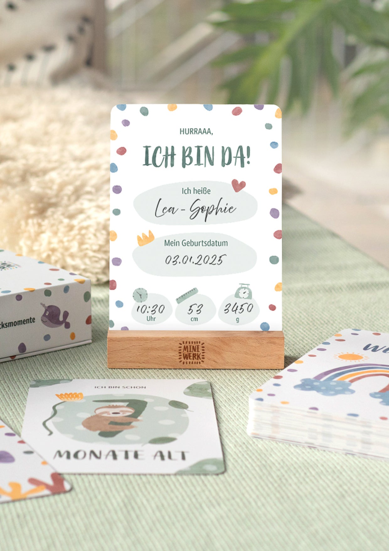 - 60 Baby Meilensteinkarten inklusive Holzsockel und schöner Geschenkeverpackung mit Magnetverschluss